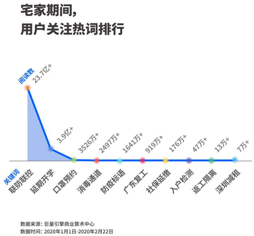 在1月1日至2月22日的頭條用戶閱讀數(shù)據(jù)中,聯(lián)防聯(lián)控、延期開學(xué)、口罩預(yù)約成為頭條平臺(tái)上最熱的關(guān)鍵詞前三位。此外、社保延繳、返工隔離等政府措施都被疫情下的手機(jī)用戶頻繁閱讀。