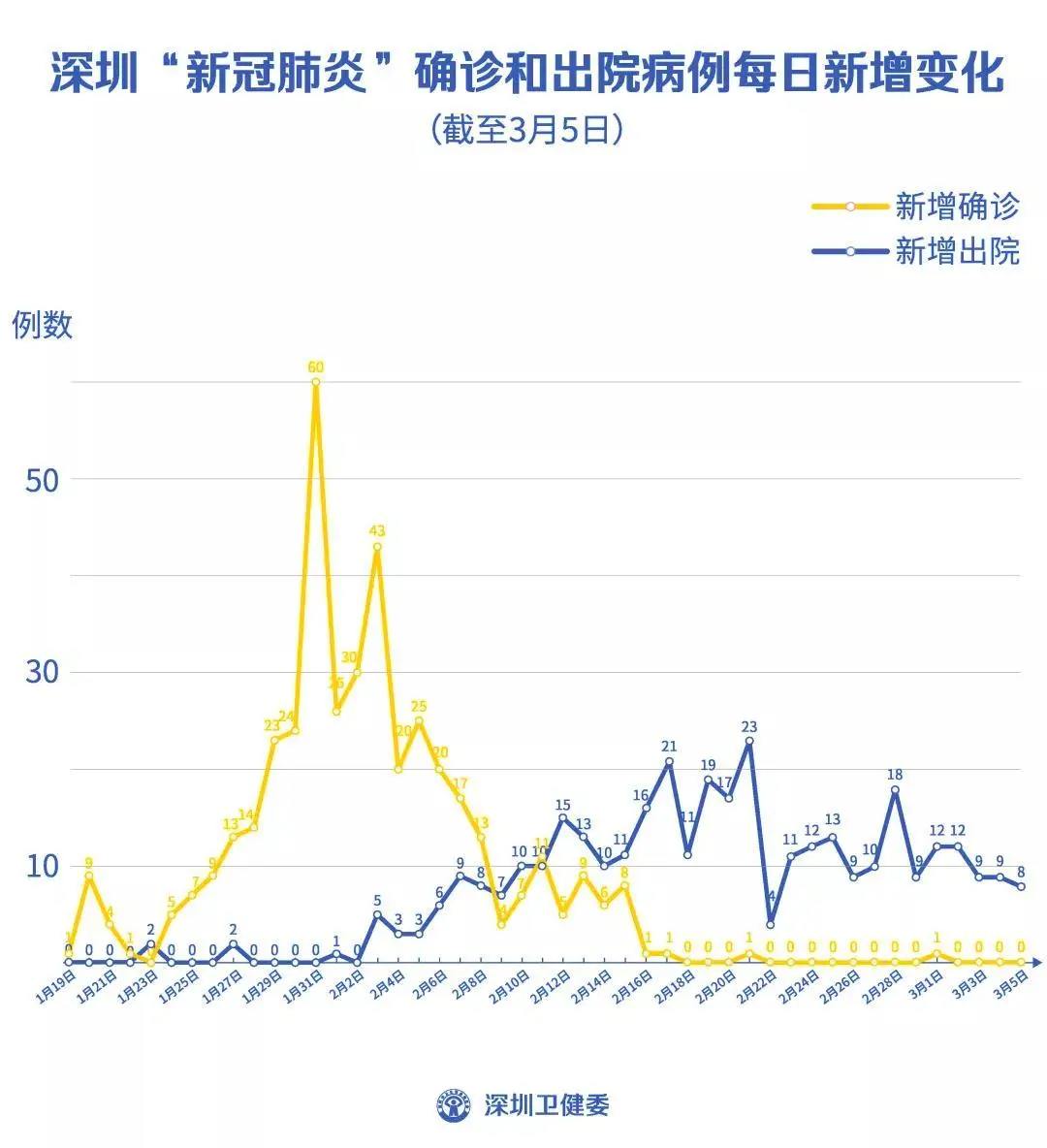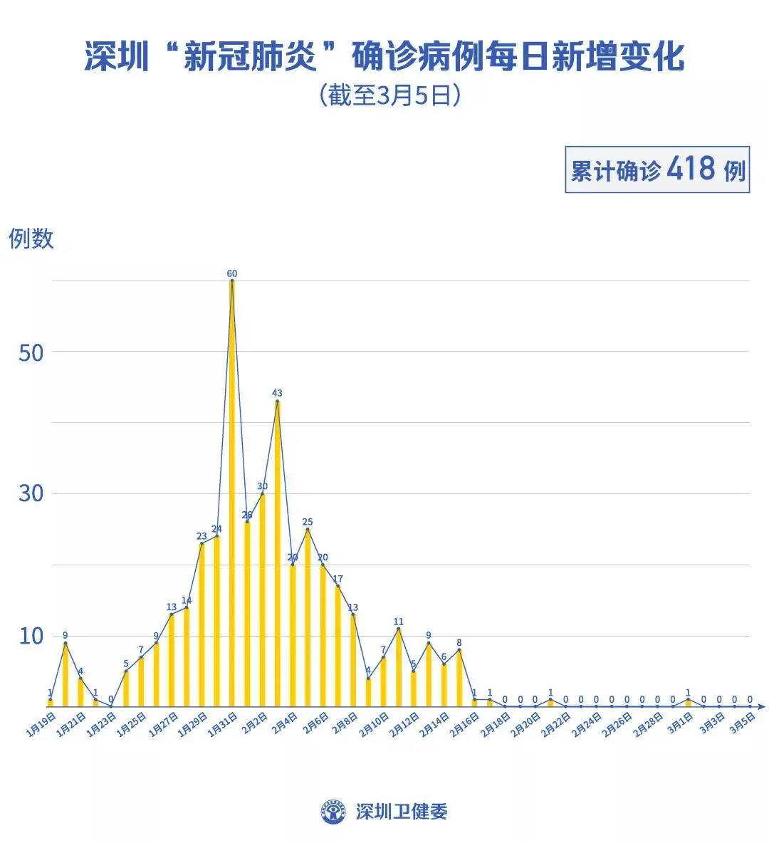 截至3月5日24時(shí),深圳累計(jì)報(bào)告“新冠肺炎”確診病例418例。3月5日當(dāng)天全市無(wú)新增確診病例,當(dāng)天出院病例8例(從2月26日起不再公布出院個(gè)案)。 累計(jì)報(bào)告確診病例中,男性198例、女性220例。 按照病例管理地區(qū)劃分,南山區(qū)87例、福田區(qū)82例、龍崗區(qū)71例、寶安區(qū)62例、龍華區(qū)34例、羅湖區(qū)32例、光明區(qū)11例、坪山區(qū)7例、鹽田區(qū)6例、大鵬新區(qū)2例、其他(指由機(jī)場(chǎng)、車(chē)站、碼頭、關(guān)口、路卡等直接送往定點(diǎn)醫(yī)院的)24例。 目前,重癥4例、危重癥3例,死亡3例,累計(jì)出院358例。 57例確診病例均在深圳市第三人民醫(yī)院隔離治療。 97例密切接觸者正在接受醫(yī)學(xué)觀察。 資料來(lái)源:深圳市疾控中心、深圳市衛(wèi)健委、廣東省衛(wèi)健委
