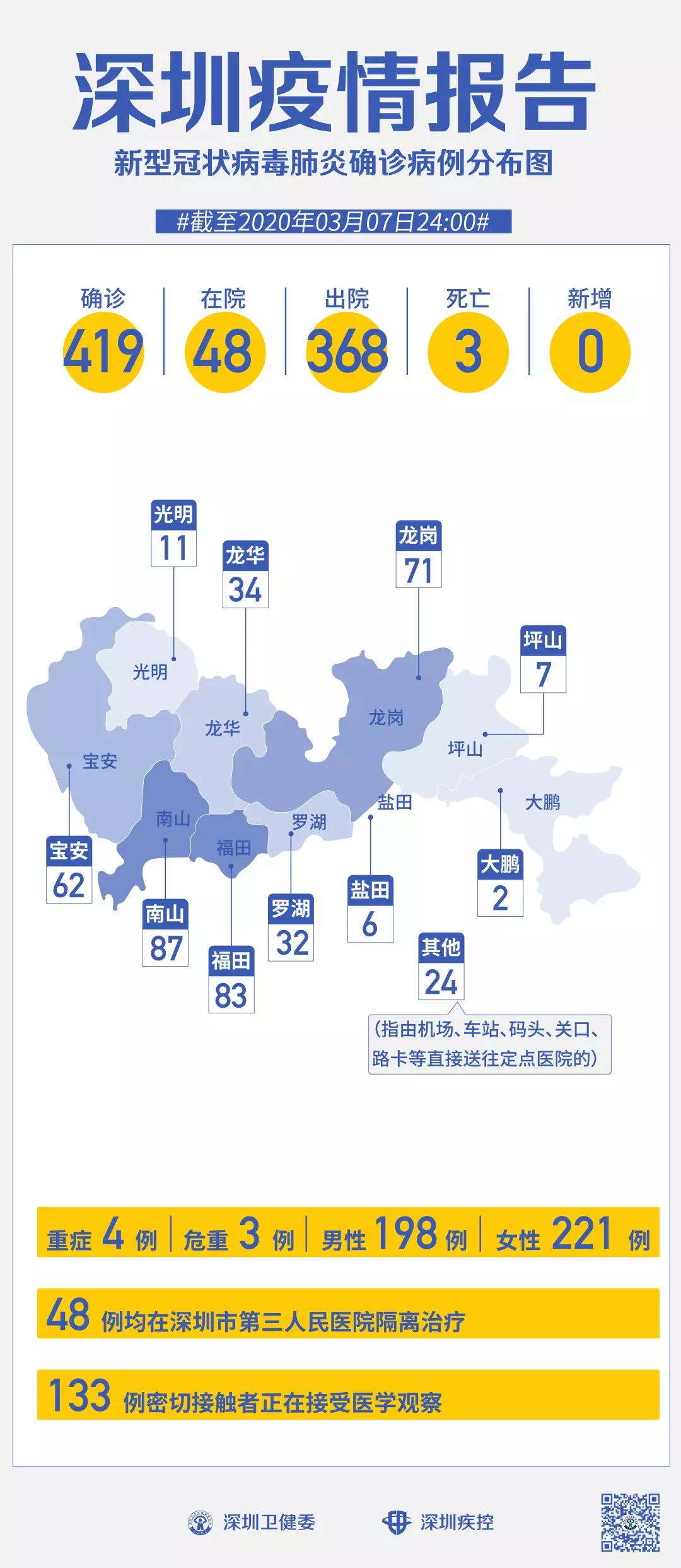 截至3月7日24時,深圳累計(jì)報(bào)告“新冠肺炎”確診病例419例。3月7日當(dāng)天全市無新增確診病例,當(dāng)天出院病例7例(從2月26日起不再公布出院個案)。