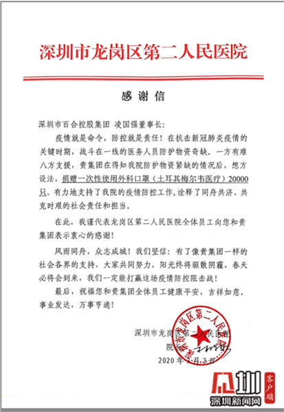 “我不認(rèn)識(shí)你,但我要謝謝你!”3月2日,龍崗區(qū)第二人民醫(yī)院院長(zhǎng)林源泉還特地向百合集團(tuán)凌國(guó)強(qiáng)董事長(zhǎng)寫(xiě)了一封感謝信。