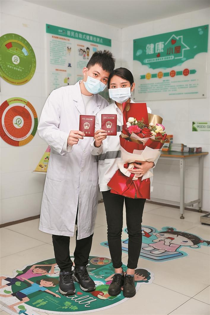 “其實(shí)我們最初選定領(lǐng)結(jié)婚證的日子是2月2日,但當(dāng)時(shí)正值抗擊疫情的緊張時(shí)期,我和愛(ài)人都在抗疫一線緊張忙碌,根本沒(méi)有時(shí)間考慮領(lǐng)證的事情?!辩娪襁B說(shuō)。她和愛(ài)人曾煥文都是1994年出生的,兩人是師兄妹,也是抗疫一線的醫(yī)務(wù)人員。鐘玉連是龍崗區(qū)坂田衛(wèi)生監(jiān)督分所(預(yù)防保健所)疾控科的骨干,曾煥文是光明區(qū)合水口社康中心的一名醫(yī)生。對(duì)于決定推遲領(lǐng)結(jié)婚證一事,他們表示“雙方互相都特別理解,畢竟工作還是第一位的?!?/p>