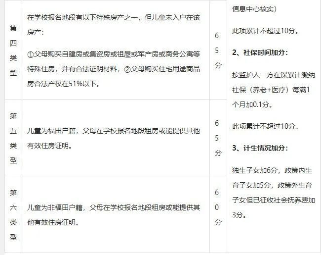 此外,"寶安戶籍,學區(qū)自購商品房"、"深圳其他區(qū)戶籍,學區(qū)自購商品房"、"寶安戶籍,無房租房"、"深圳其他區(qū)戶籍,無房租房"、"非深戶購房"、"寶安戶籍,有房租房"等情況分別在原有基礎分上另加5分。