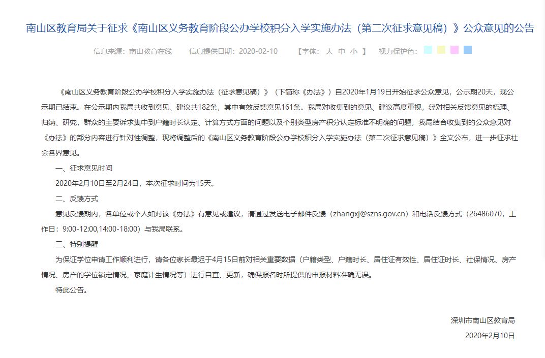 1月19日,南山區(qū)教育局第一次征求意見發(fā)出后,共收集到關于積分算法調(diào)整的反饋意見182條,并于2月10日第二次發(fā)布《南山區(qū)義務教育階段公布學校積分入學實施辦法》征求意見稿(以下簡稱《意見》),根據(jù)《意見》內(nèi)容,擬調(diào)整2020年積分入學辦法。