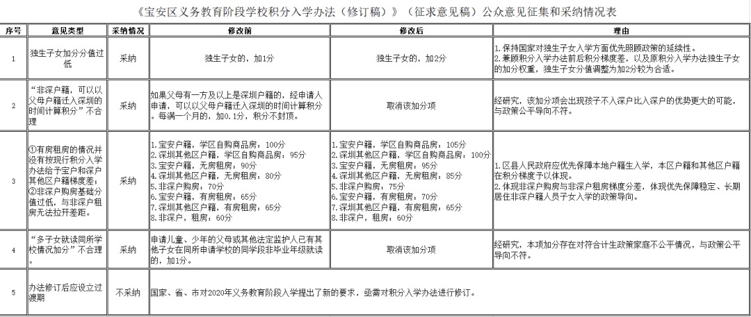 在新修訂稿中,寶安區(qū)教育局結(jié)合市民意見反饋,擬將獨生子女加分由1分調(diào)整至2分,并取消兩項加分項,同時對部分情況分值進行調(diào)整,以體現(xiàn)積分梯度。