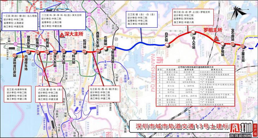 據(jù)了解,地鐵13號(hào)線(xiàn)由南至北穿過(guò)南山區(qū)、寶安區(qū)和光明新區(qū)。項(xiàng)目共設(shè)車(chē)站16座,線(xiàn)路總長(zhǎng)22.436公里,出入線(xiàn)與后海站接軌,將穿越已運(yùn)營(yíng)的地鐵1號(hào)線(xiàn)、2號(hào)線(xiàn)、5號(hào)線(xiàn)、11號(hào)線(xiàn)。由于沿途工程地質(zhì)條件復(fù)雜、換乘站多、工程實(shí)施難度大、長(zhǎng)區(qū)間盾構(gòu)、拆遷工作繁重、交通疏解復(fù)雜等原因,13號(hào)線(xiàn)被稱(chēng)為深圳地鐵建設(shè)史上最難的地鐵線(xiàn)路之一。