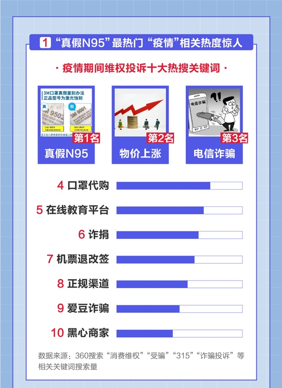 深圳商報2020年3月15日訊 360搜索、360瀏覽器今日發(fā)布《315消費者維權數(shù)據(jù)報告》(以下簡稱《報告》)。報告顯示,“真假N95”、“口罩代購”等與口罩質量相關的訊息成熱議話題。