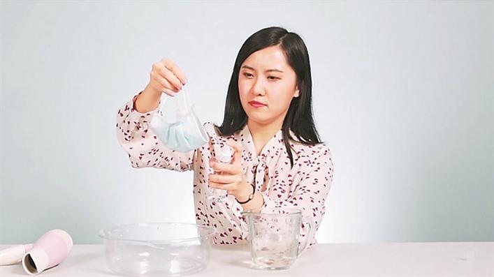 為驗(yàn)證這一說法,記者又做了一次實(shí)驗(yàn)。將噴過酒精漏水的口罩用吹風(fēng)機(jī)吹干后,再去接水。發(fā)現(xiàn)原本漏水的口罩又能兜住水了。