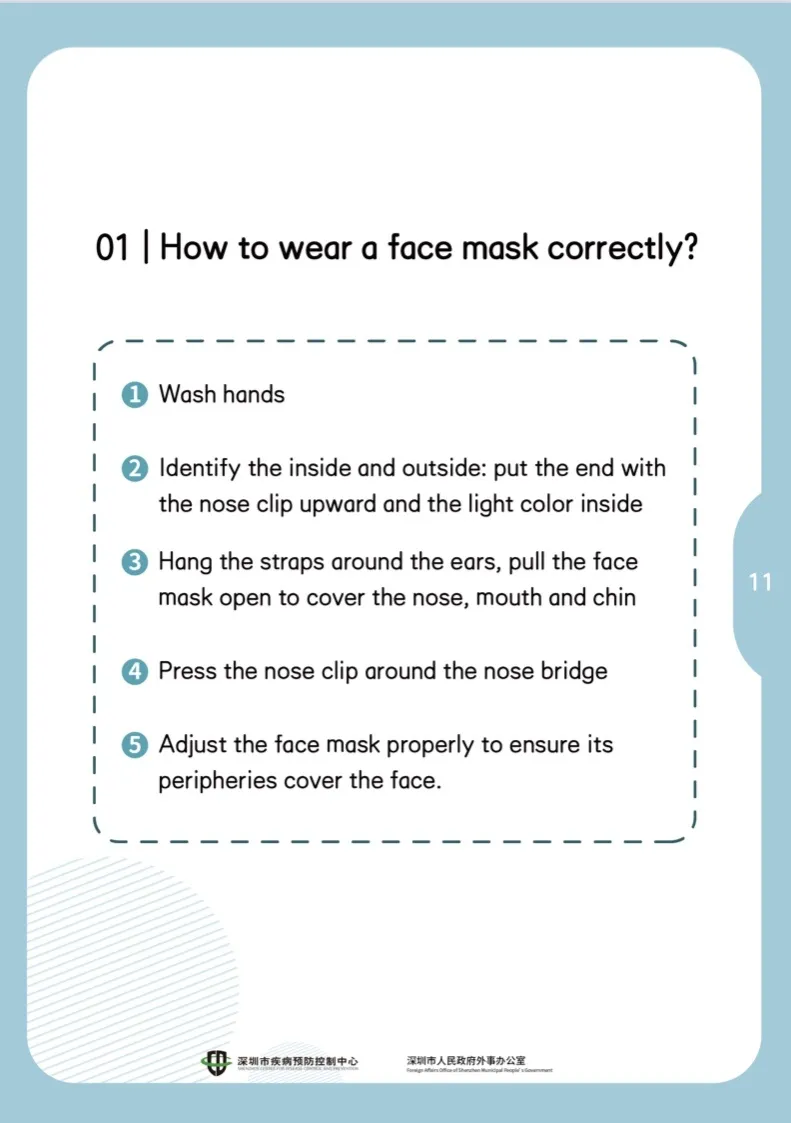 首先洗手——確認(rèn)內(nèi)外:有鼻夾的一端朝上,淺色一面朝自己——將掛繩繞在耳朵上,拉開口罩,把鼻、口、下巴罩好——把鼻夾沿鼻梁處貼緊——適當(dāng)調(diào)整口罩,使口罩周邊充分貼合面部。