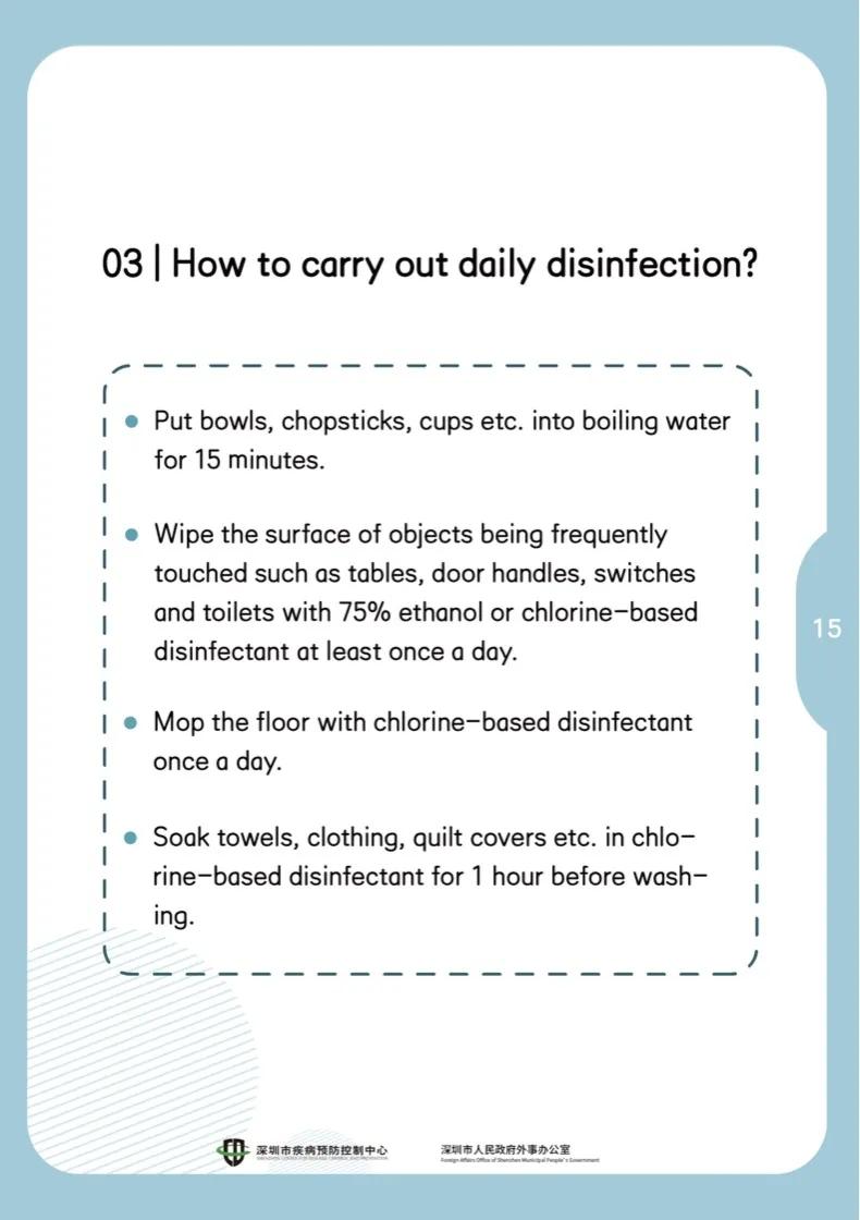 臺(tái)面、門把手、開關(guān)、馬桶等常接觸使用的物品表面,每天至少用75%酒精或含氯消毒劑擦拭一次。