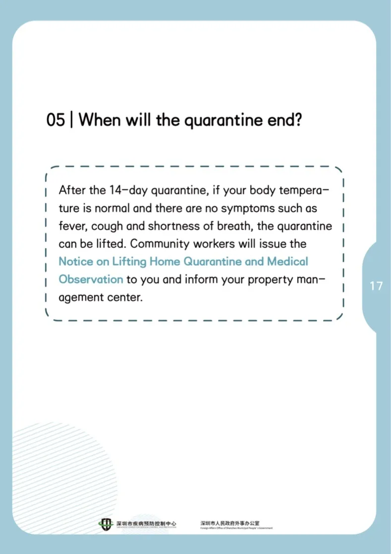 隔離滿14天后,如果體溫正常,無(wú)發(fā)熱、咳嗽、氣促這些癥狀,就可以解除隔離了。社區(qū)工作人員會(huì)發(fā)放《解除居家隔離醫(yī)學(xué)觀察告知書》,并通知物業(yè)。