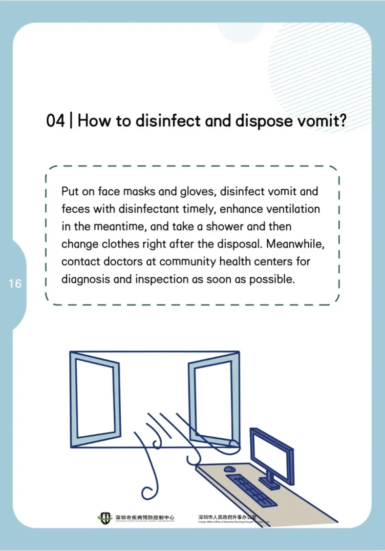 戴上口罩及手套,及時(shí)用消毒液對(duì)嘔吐物、排泄物進(jìn)行消毒,同時(shí)加強(qiáng)通風(fēng),處理完后及時(shí)洗浴更換衣物。同時(shí)盡快聯(lián)系社康醫(yī)生進(jìn)行診查。