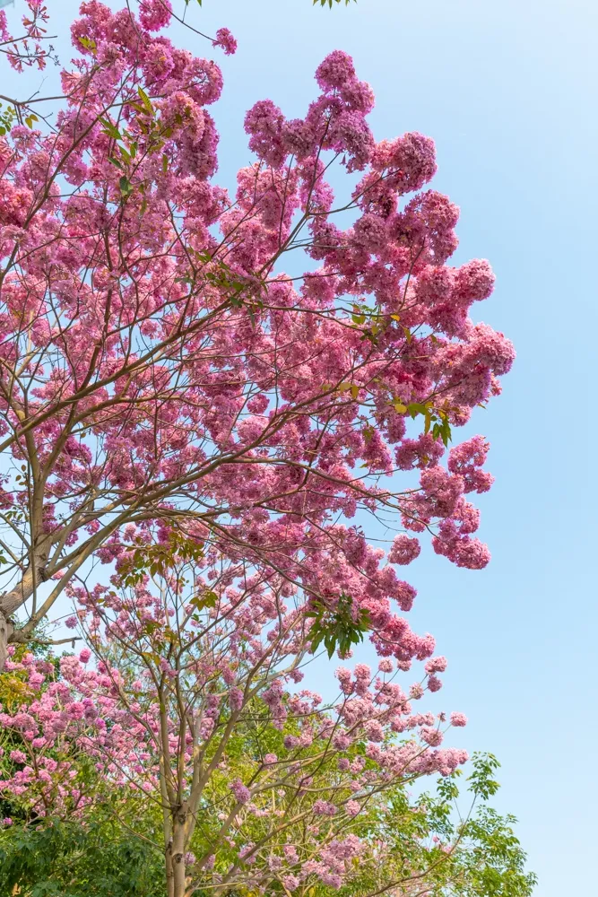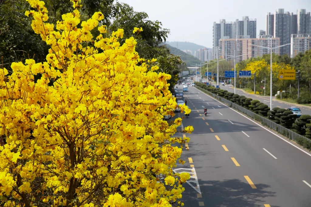 寶安航城街道機(jī)場南路兩旁,風(fēng)鈴木花綻放。