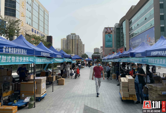 華強(qiáng)北步行街上的非接觸物流快遞區(qū)。