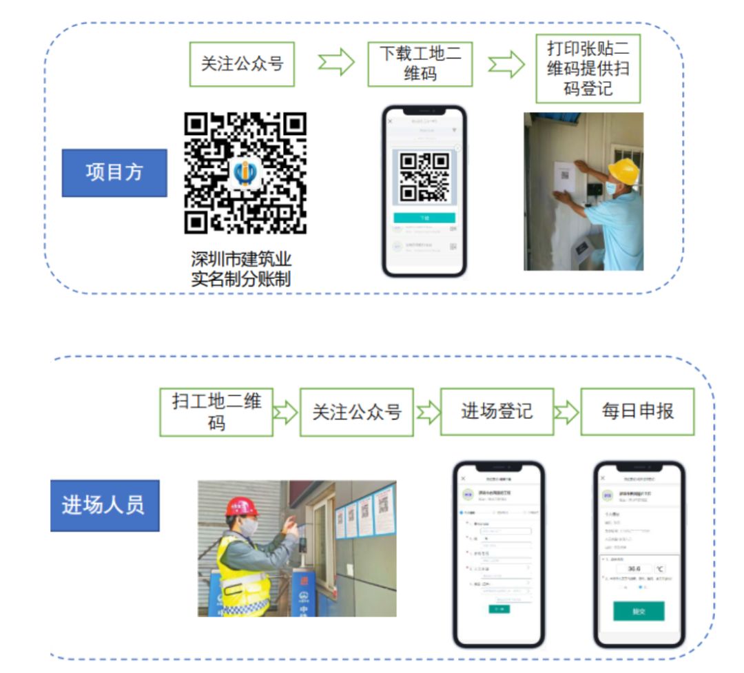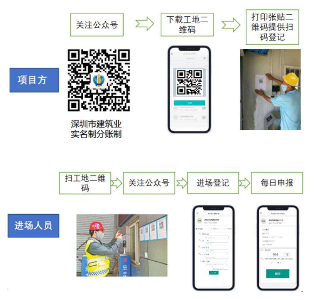 市場建設(shè)單位應(yīng)關(guān)注深圳市建筑業(yè)實(shí)名制分賬制微信公眾號,獲取本工地的微信二維碼,并將工地二維碼張貼至工地公示區(qū)域。施工人員每日進(jìn)場前測溫后,掃碼申報(bào)個(gè)人測溫結(jié)果和健康狀況。