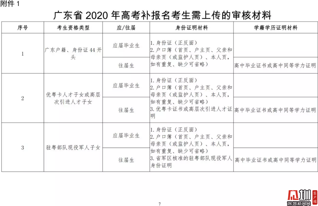 見(jiàn)圳客戶端·深圳新聞網(wǎng)2020年3月19日訊(見(jiàn)圳客戶端、深圳新聞網(wǎng)記者 金洪竹)3月18日,記者從廣東省招生委員會(huì)辦公室獲悉,為滿足退伍軍人、運(yùn)動(dòng)訓(xùn)練及武術(shù)與民族傳統(tǒng)體育考生、高職院校自主招生考生等符合我省高考條件,因各種原因尚未參加高考報(bào)名人員的需求,經(jīng)研究決定安排一次高考補(bǔ)報(bào)名,補(bǔ)報(bào)名時(shí)間為3月23-26日。同時(shí),為確保考生和考試工作人員的生命安全和身體健康,減少聚集,本次高考補(bǔ)報(bào)名采取先線上辦理、后補(bǔ)驗(yàn)材料的方式進(jìn)行。