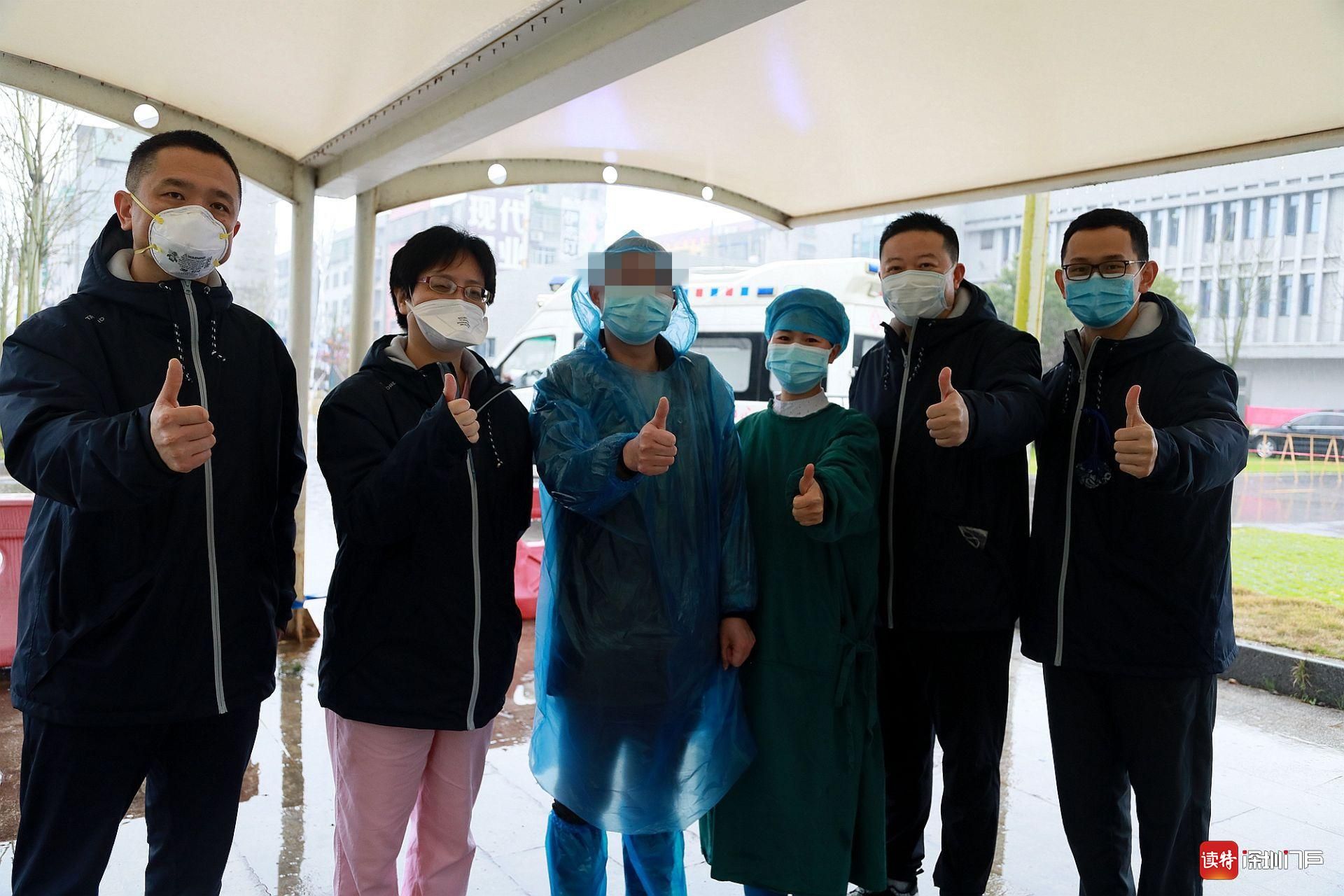 3月8日,監(jiān)利縣首例新冠肺炎重癥患者張建(化名,中)治愈出院后與深圳醫(yī)療隊醫(yī)護(hù)人員合影留念。