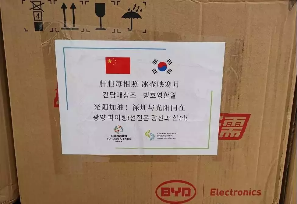 在韓國光陽寄來深圳的物資箱上,寫著“心相通,民相親,天涯咫尺間”。而在深圳此次寄出的物資箱上,也深情引用了韓國詩人許筠的一句詩:“肝膽每相照,冰壺映寒月。”