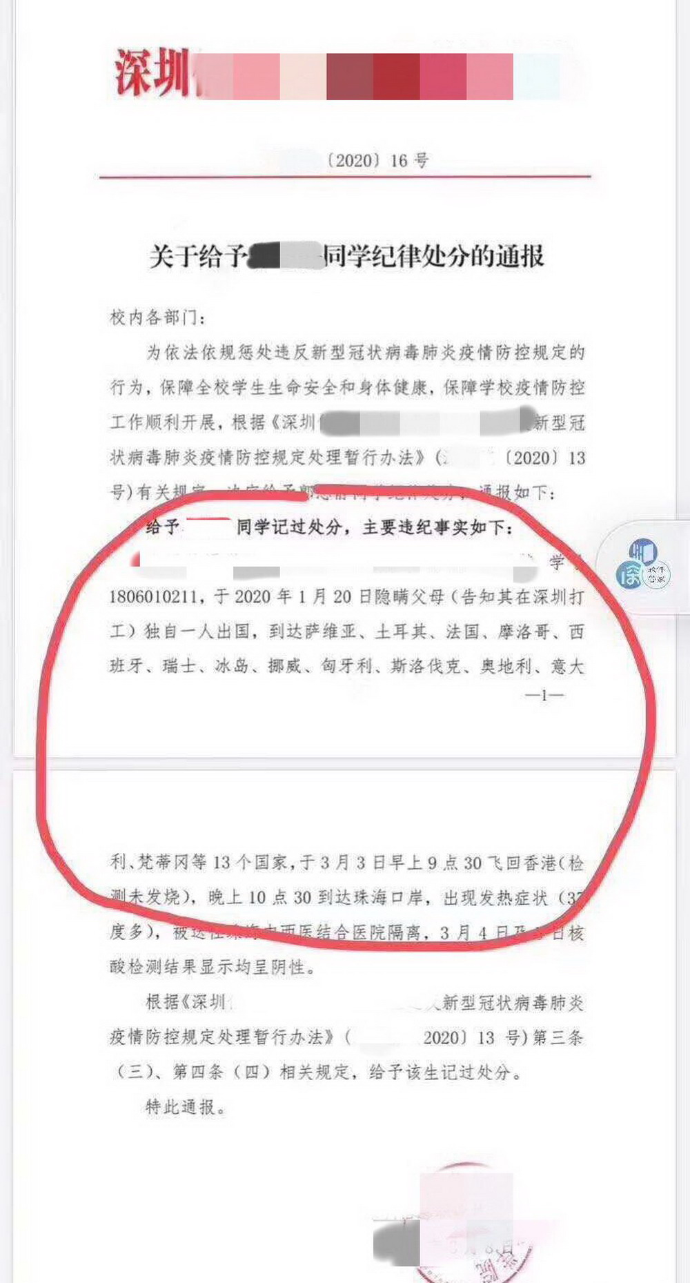 3月3日,小Y從珠海入境回國,在過海關(guān)時出現(xiàn)發(fā)燒癥狀并送往珠海中西醫(yī)結(jié)合醫(yī)院進(jìn)行隔離檢測。“在過關(guān)的時候需要填寫旅行史,我如實填寫了,因為曾經(jīng)到過意大利等國家所以海關(guān)會重點監(jiān)測我。因為自身免疫力低,以及倒時差的原因,有些感冒低燒,但我也沒有隱瞞什么,如實闡述了我的行程和身體狀況,也很配合海關(guān)人員的調(diào)查?!?月4日、5日,當(dāng)事人核酸檢測結(jié)果均為陰性,由于違反定瞞報行程,小Y被學(xué)校予以記過處分。對于學(xué)校的處分決定,她坦言接受。“我沒有如實向?qū)W校匯報我的行程,我接受學(xué)校對我的處分?!?/p>