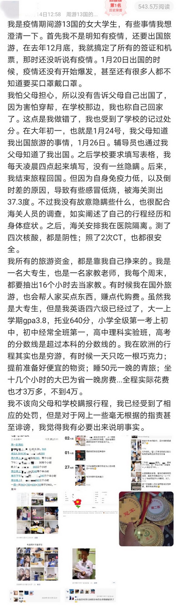 小Y后來知道,她的經(jīng)歷在網(wǎng)上引起關(guān)注并引發(fā)網(wǎng)友質(zhì)疑。記者從網(wǎng)上了解到,網(wǎng)友目前主要質(zhì)疑其旅行費用來源,對此,小Y表示:“因為之前在網(wǎng)上看到別的女生花一萬五窮游了11個國家,所以我也很想試一下,就開始很仔細(xì)的規(guī)劃,花了很多心思,我所有的旅行費用都是我自己平時做家教賺的,出去玩也基本上是窮游?!贝送?,小Y還將旅行所有費用明細(xì)列出并在本人微博上公布。