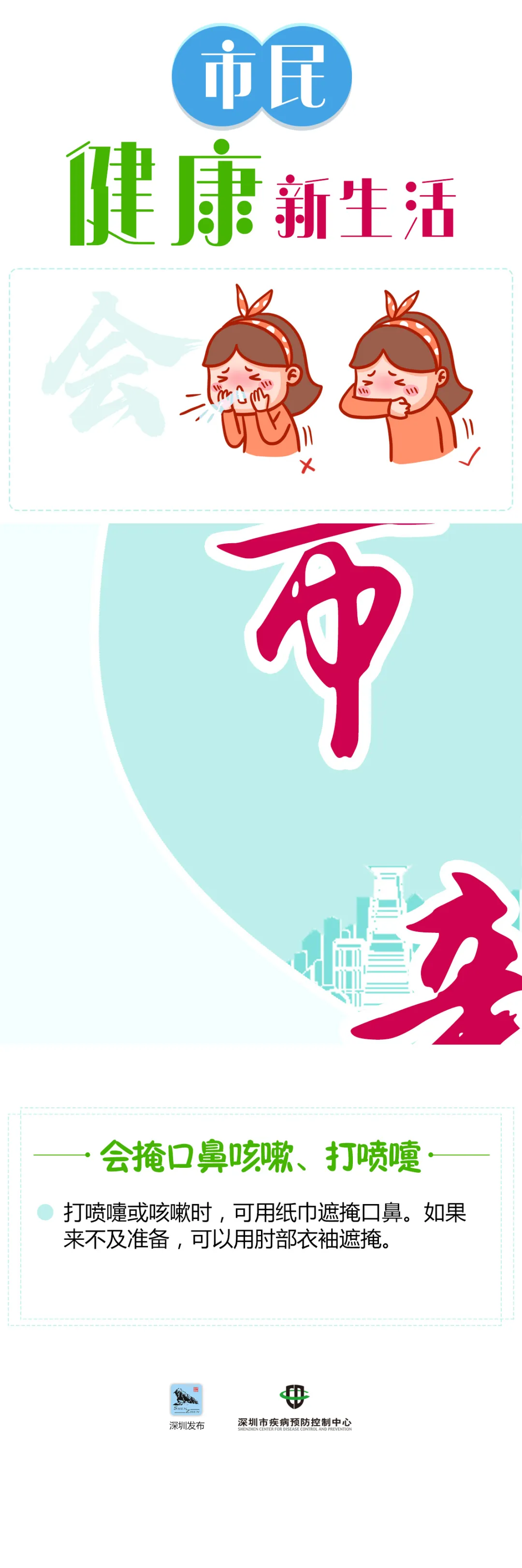 打噴嚏或咳嗽時(shí),可用紙巾遮掩口鼻。如果來(lái)不及準(zhǔn)備,可以用肘部衣袖遮掩。