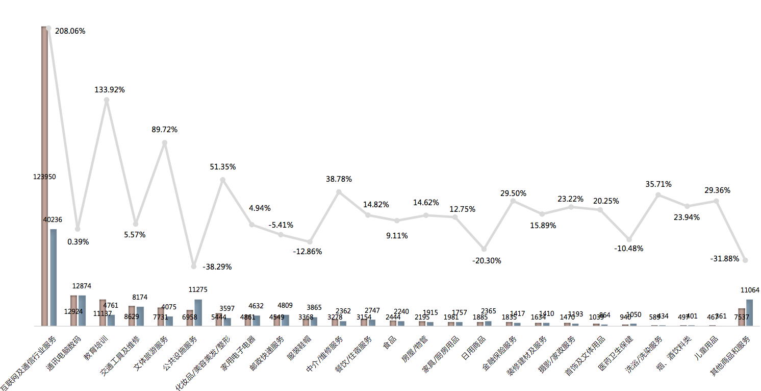 據統(tǒng)計,2019年,互聯網及通信行業(yè)服務、通訊電腦數碼、教育培訓行業(yè)投訴量排名位居前三,分別為123950宗、12924宗、11137宗,分別占全年投訴總量的56.21%、5.86%、5.05%。從投訴量變化情況來看,互聯網及通信行業(yè)服務、文體旅游服務、教育培訓及化妝品/美容美發(fā)/整形四個行業(yè)投訴量同比增長超過50%;公共設施服務、日用商品、服裝鞋帽以及醫(yī)藥衛(wèi)生保健四個行業(yè)投訴量同比下降超過10%。其中公共設施服務類的減幅最大,為38.29%,主要原因為共享出行行業(yè)洗牌,部分企業(yè)退出市場,投訴量隨之下降。