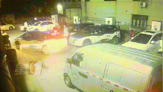 監(jiān)控畫面顯示,25日晚上23點左右,一輛出租車和一輛面包車先后到達(dá)龍崗大道木棉灣路段的一個充電站。出租車司機(jī)先找到了一個位置,準(zhǔn)備倒入充電時,后面的面包車突然往前開,兩名司機(jī)因為停車位的問題發(fā)生爭執(zhí)。隨后,出租車司機(jī)下車?yán)碚摚瑒邮滞妻嗣姘囁緳C(jī)一下。