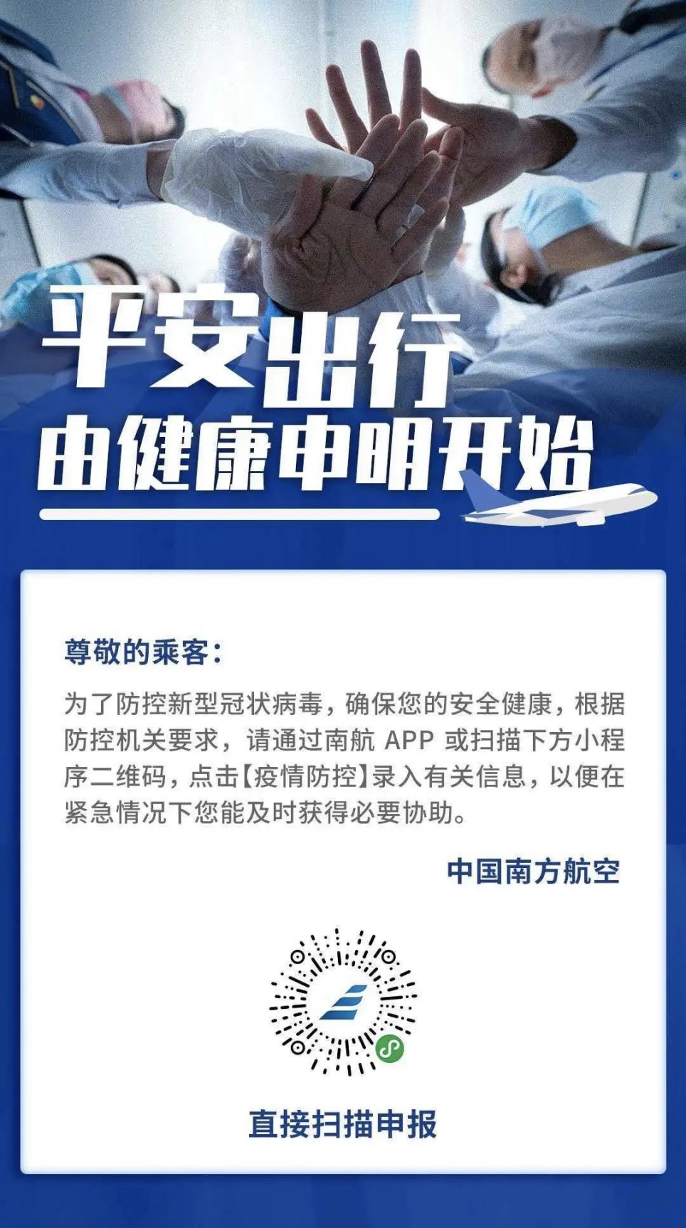 目前南航啟用“旅客健康申明”線上填寫,方便快捷,請(qǐng)自覺申報(bào)支持乘機(jī)疫情防控工作。
