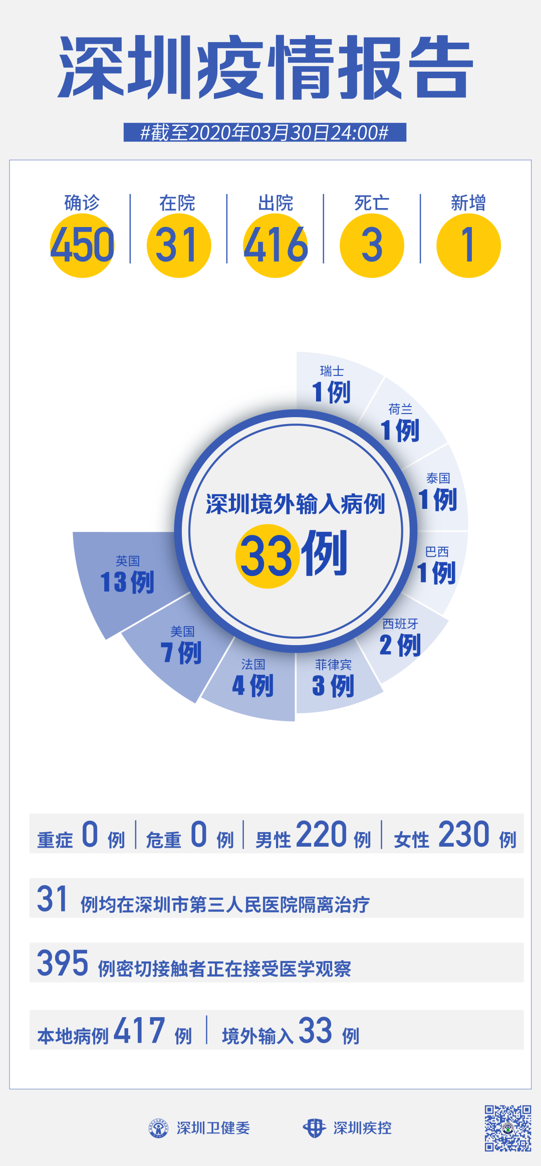 截至3月30日24時(shí),深圳累計(jì)報(bào)告“新冠肺炎”病例450例。3月30日當(dāng)天新增1例。