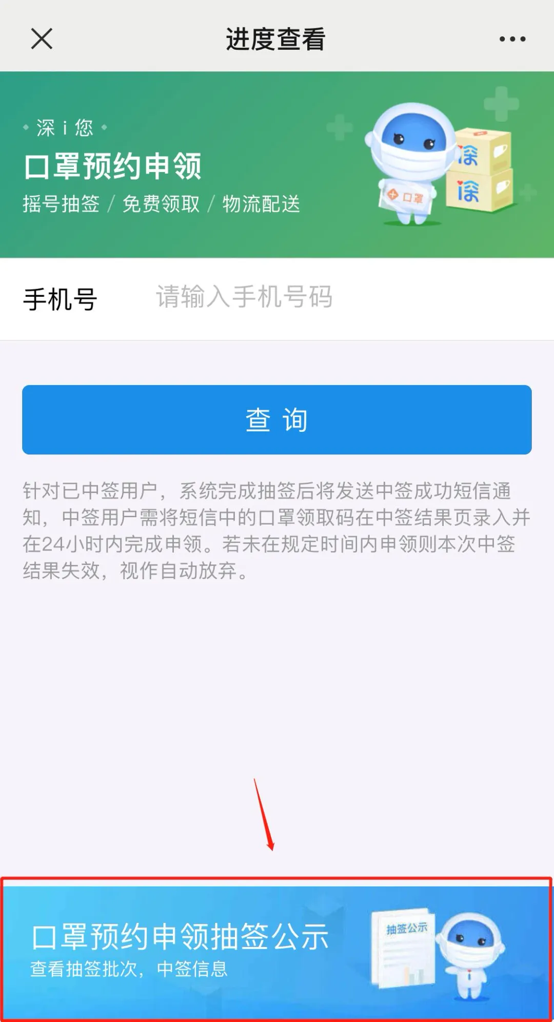 個人中簽名單:可在“i深圳”微信公眾號首頁-口罩預(yù)約-市民專區(qū)-進(jìn)度查看的頁面下方“口罩預(yù)約申領(lǐng)抽簽公示”查看