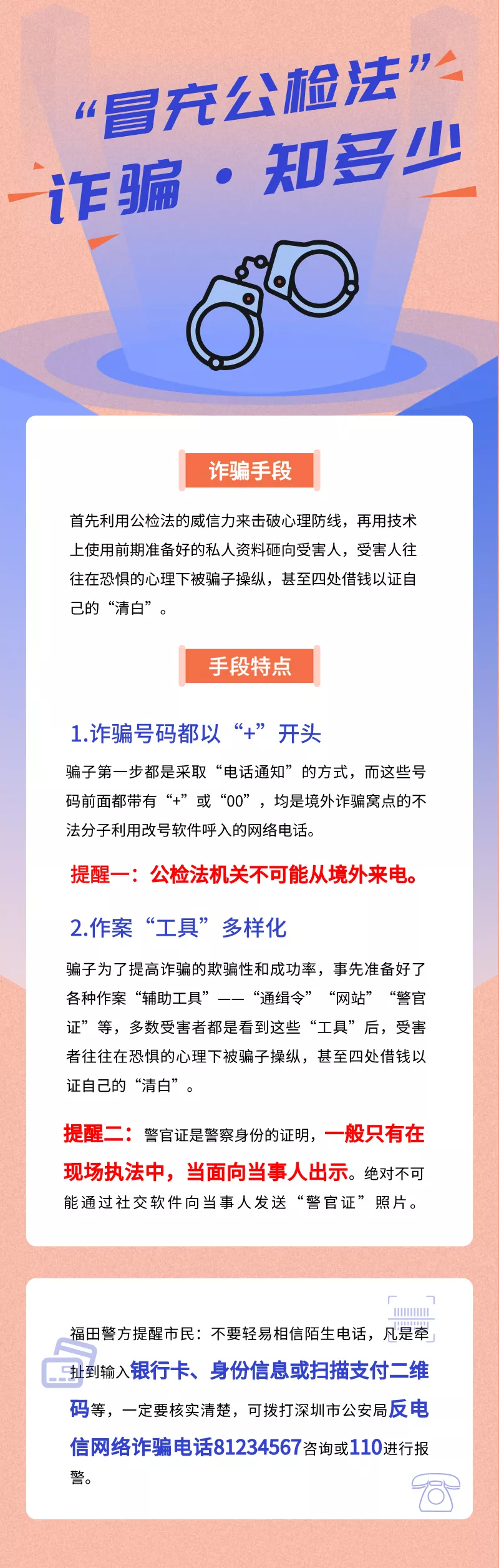 徐女士接到的是冒充公檢法詐騙的電話,騙子經(jīng)常冒充公安、檢察院等執(zhí)法人員,謊稱市民身份證辦理了多張銀行卡涉嫌洗錢或非法集資,給事主扣上涉嫌違法犯罪的帽子,并表示需要轉(zhuǎn)錢到指定的“安全賬戶”,以此證明自己的清白。