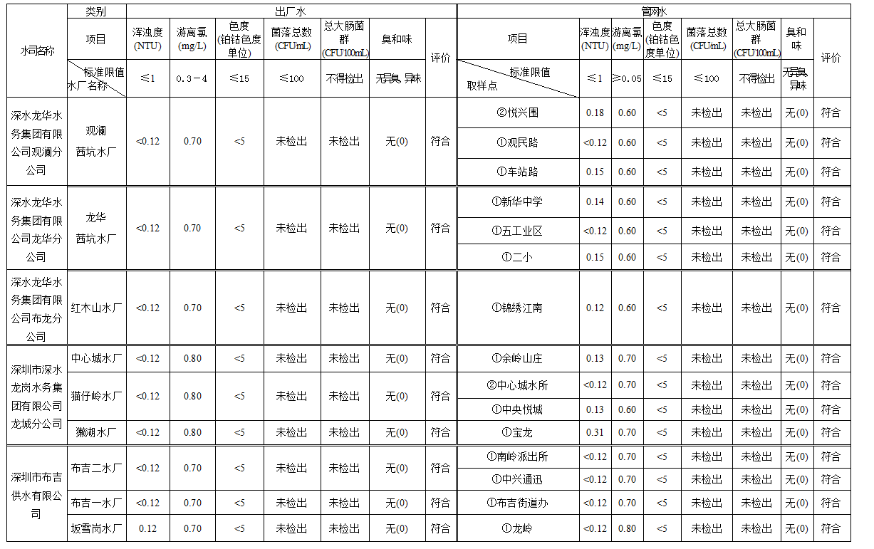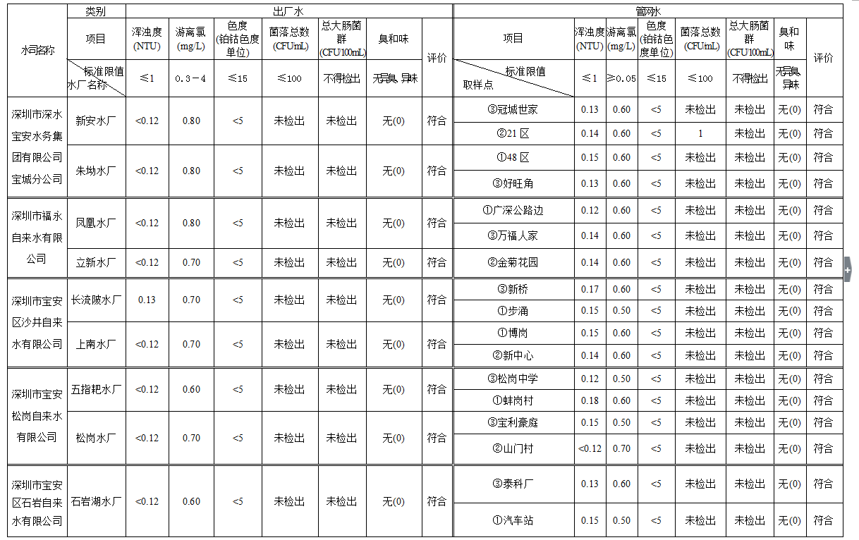 見(jiàn)圳客戶端·深圳新聞網(wǎng)2020年4月4日訊(見(jiàn)圳客戶端、深圳新聞網(wǎng)記者葉梅)2020年2月,深圳市水務(wù)局對(duì)全市42個(gè)水廠出廠水水樣以及68個(gè)管網(wǎng)水水樣進(jìn)行了抽檢。檢測(cè)結(jié)果表明,依據(jù)GB5749—2006《生活飲用水衛(wèi)生標(biāo)準(zhǔn)》,所有受檢42個(gè)出廠水水樣和68個(gè)管網(wǎng)水水樣的渾濁度、消毒劑(游離氯或二氧化氯或總氯)、色度、菌落總數(shù)、總大腸菌群及臭和味共6項(xiàng)常規(guī)指標(biāo)全部符合該標(biāo)準(zhǔn)的規(guī)定,出廠水水樣合格率為100%,管網(wǎng)水合格率為100%。
