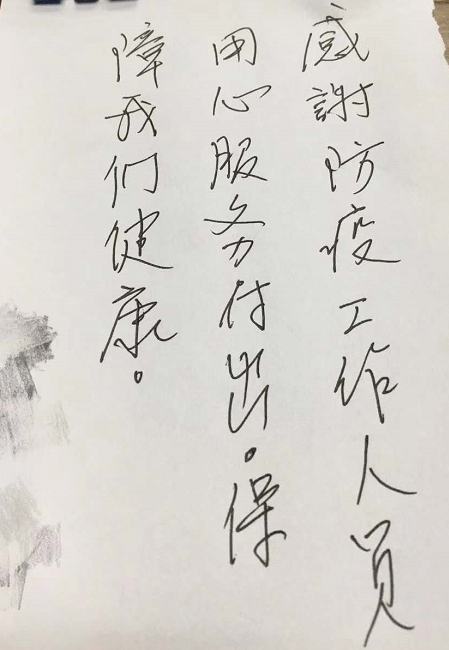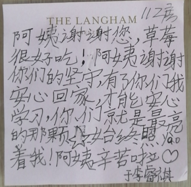 每當(dāng)看到了一批批解除隔離的人開開心心地收拾行李回家,看到客人留下的感謝信、微信留言,尤其是聽到客人們離開時一句句真摯的話語,同事們都倍感欣慰,更加堅信風(fēng)雨過后,終會見到彩虹。