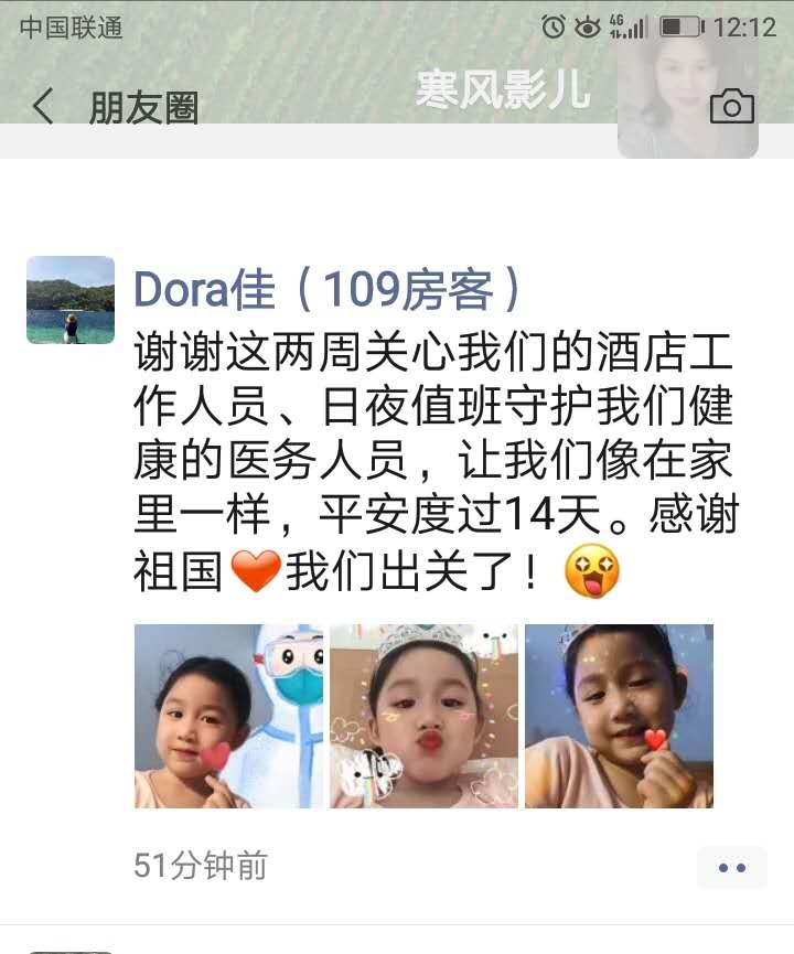 四是對確有特殊要求的隔離人員進行個性化服務(wù)。住213的某先生從文萊回國因家里原因在隔離期間情緒波動比較大,要求給他買10盒煙及啤酒,楊梅林了解到這一情況后,第一時間添加了客人的微信,只要一有空閑就找客人聊天并開導(dǎo)他不要有心理壓力,幾天下來,客人明顯開朗了很多,煙已經(jīng)很少抽了,啤酒一餐只喝一瓶,考慮到安全問題,每餐均被給楊梅林部分“退貨”了。還有401房單獨住了一位11歲的小女孩,劉群每天有空就給小朋友打電話,噓寒問暖,對入住酒店的特殊客人或帶小朋友的房間楊梅林和劉群服務(wù)的特別細(xì)致。她們常掛嘴邊的一句話是:隔離人不隔離愛,讓他們感受到家一樣的溫暖。