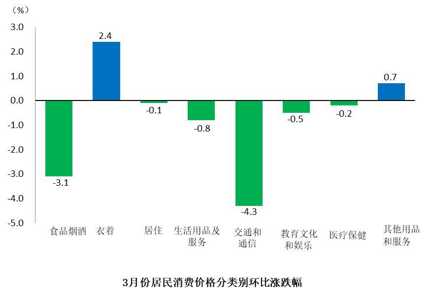 總體來看,食品價格環(huán)比下降4.3%,非食品價格環(huán)比下降0.7%;服務(wù)價格環(huán)比下降0.9%,消費品價格環(huán)比下降1.9%。