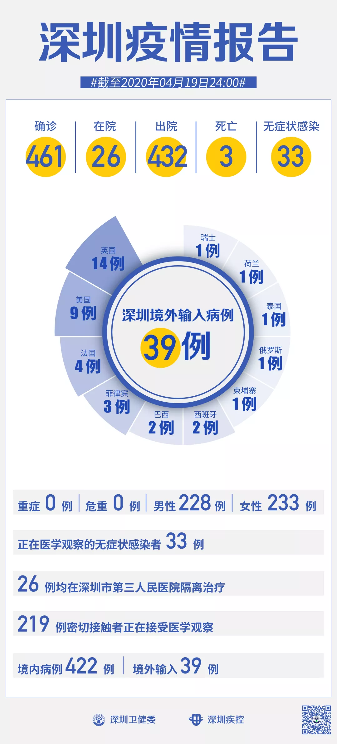 截至4月19日24時,深圳累計報告新冠肺炎病例461例。4月19日當天新增無癥狀感染者2例,出院1例。
