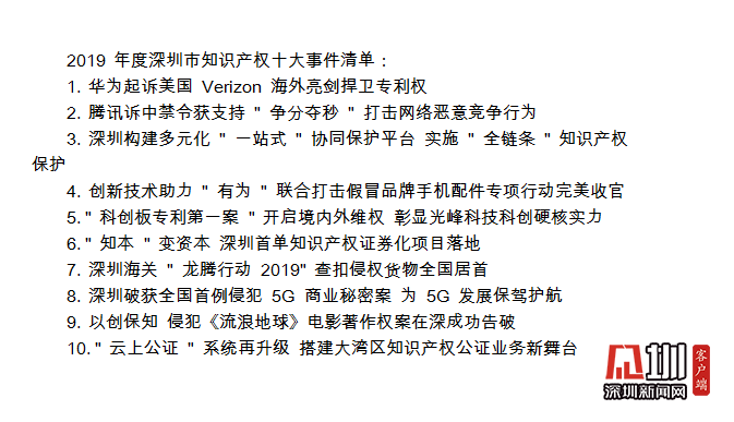 值得關注的是,在深圳市知識產權工作會議期間,全市2019年度知識產權十大事件正式對外發(fā)布,華為起訴美國Verizon、騰訊訴中禁令獲支持、“有為”聯(lián)合打擊假冒品牌手機配件專項行動完美收官等事件上榜。