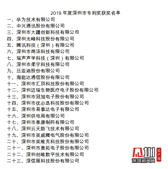 會議同期還發(fā)布了2019年度深圳市專利獎獲獎企業(yè)名單,華為技術有限公司、中興通訊股份有限公司、深圳市大疆創(chuàng)新科技有限公司、深圳光峰科技股份有限公司、騰訊科技(深圳)有限公司、深圳市商湯科技有限公司、瑞聲聲學科技(深圳)有限公司等23家單位獲獎。