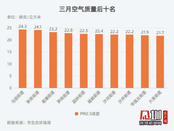 記者從深圳市生態(tài)環(huán)境局獲悉,2020年3月,全市74個(gè)街道PM2.5濃度在14.6-24.3微克/立方米之間,均值為19.0微克/立方米。