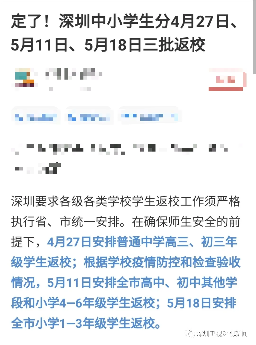 近日,有媒體報(bào)道稱,深圳中小學(xué)生返校時間已確定。5月11日安排全市高中、初中其他學(xué)段和小學(xué)4—6年級學(xué)生返校;5月18日安排全市小學(xué)1—3年級學(xué)生返校。