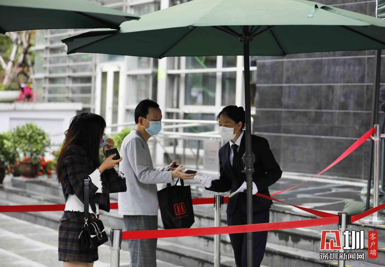 圖書館工作人員正在為入館市民測(cè)量體溫。
