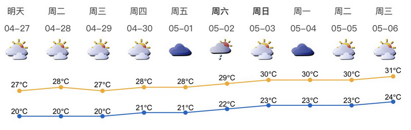 市氣象局預(yù)計(jì),深圳未來(lái)一周天氣較平穩(wěn),氣溫逐日上升:周一至周三(27-30日)陽(yáng)光增多,氣溫回升,溫暖干燥,周五至周日(5月1-3日)多云間陰天,早晚有輕霧,間中有分散陣雨。