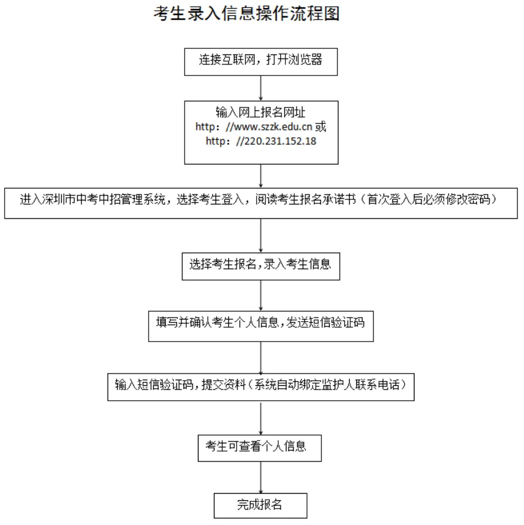 見(jiàn)圳客戶端·深圳新聞網(wǎng)2020年4月30日訊 據(jù)深圳市教育局消息,2020年深圳高中階段學(xué)校招生考試(以下簡(jiǎn)稱“中考”)報(bào)名定于5月6日-15日進(jìn)行,考試時(shí)間為7月20日-21日。 今年本市應(yīng)屆初中畢業(yè)生仍繼續(xù)在就讀學(xué)校集體辦理報(bào)名手續(xù)。符合深圳中考報(bào)名條件的深圳戶籍往屆生、在市外就讀的深圳戶籍應(yīng)屆初中畢業(yè)生(以下簡(jiǎn)稱“社會(huì)類考生”)采用網(wǎng)上報(bào)名方式進(jìn)行報(bào)名。 報(bào)名條件 一、具有我市戶籍的初中畢業(yè)生,可以在我市報(bào)名參加中考。 二、具有我市初三學(xué)籍的隨遷子女可以報(bào)名參加中考,同時(shí)符合以下條件的,可以參加相應(yīng)的公辦普高、民辦普高和中職學(xué)校的劃線錄取。 (一)父親或母親在我市具有合法穩(wěn)定職業(yè); (二)父親或母親在我市具有合法穩(wěn)定住所; (三)父親或母親持有有效《深圳經(jīng)濟(jì)特區(qū)居住證》; (四)父親或母親在我市繳納基本養(yǎng)老保險(xiǎn)及基本醫(yī)療保險(xiǎn),且至少其中一個(gè)險(xiǎn)種累計(jì)繳費(fèi)滿3年,社保累計(jì)年限計(jì)算截至2020年8月31日; (五)隨遷子女在我市具有3年完整初中學(xué)籍。 不符合上述條件但具有我市初中學(xué)籍的隨遷子女,可以在我市參加中考,但僅限于參加民辦普高補(bǔ)錄或中職學(xué)校注冊(cè)入學(xué)。 三、高中階段學(xué)校在校生不得報(bào)名。 本市應(yīng)屆初中畢業(yè)生報(bào)名辦法 本市應(yīng)屆初中畢業(yè)生于5月6日至7日在就讀學(xué)校集體辦理報(bào)名手續(xù)。 今年中考繼續(xù)實(shí)行網(wǎng)上報(bào)名。要求各學(xué)校開(kāi)放計(jì)算機(jī)房,為本校考生上網(wǎng)報(bào)名提供方便。 5月8日至15日,學(xué)校組織考生進(jìn)行電子攝像,學(xué)校和考生分別上網(wǎng)錄入報(bào)名信息,考生錄入信息可參考“考生錄入信息流程圖”進(jìn)行操作。 市教育局強(qiáng)調(diào),學(xué)校不得以任何理由拒絕有本校學(xué)籍的應(yīng)屆畢業(yè)生報(bào)考(參加中職學(xué)校自主招生、注冊(cè)入學(xué)的考生,也須報(bào)名參加中考)。如有違反者,將嚴(yán)肅查處,并追究相關(guān)人員責(zé)任。同時(shí)要求各區(qū)有關(guān)職能部門(mén)、各有關(guān)學(xué)校(報(bào)名點(diǎn))要嚴(yán)格審查報(bào)名材料。對(duì)不符合報(bào)名條件、弄虛作假而被錄取的考生,一經(jīng)發(fā)現(xiàn),取消其錄取資格;已經(jīng)到錄取學(xué)校報(bào)到注冊(cè)的,取消其學(xué)籍,并追究相關(guān)人員責(zé)任。 社會(huì)類考生報(bào)名辦法 社會(huì)類考生采用網(wǎng)上報(bào)名方式進(jìn)行報(bào)名。報(bào)名考生需在5月6日至15日登錄報(bào)名網(wǎng)址(http://www.szzk.edu.cn/),按照提示進(jìn)行網(wǎng)上注冊(cè),上傳報(bào)名審核資料,由考生戶籍所在區(qū)社會(huì)報(bào)名點(diǎn)進(jìn)行線上審核,審核通過(guò)后系統(tǒng)將生成中考考生號(hào)及初始密碼,考生需用獲取的考號(hào)及密碼登錄中考中招管理系統(tǒng),填寫(xiě)個(gè)人信息,具體操作可參考“考生錄入信息流程圖”。同時(shí)需在報(bào)名截止前根據(jù)指引完成網(wǎng)上繳費(fèi)。 若考生網(wǎng)上報(bào)名審核不通過(guò),需按照系統(tǒng)的不通過(guò)原因提示,重新補(bǔ)充審核資料,如多次上傳資料失敗或?qū)徍瞬煌ㄟ^(guò),考生可撥打戶籍所在區(qū)的社會(huì)報(bào)名點(diǎn)電話進(jìn)行咨詢或電話預(yù)約,按照工作人員指示進(jìn)行操作報(bào)名,不要在未預(yù)約的情況下前往社會(huì)報(bào)名點(diǎn),盡量避免出行,減少人員聚集。 社會(huì)類考生操作流程如下圖: 考生錄入信息操作流程如下圖: 中考社會(huì)報(bào)名點(diǎn)一覽表 深圳各類考生具體報(bào)考范圍、各類升學(xué)資格申報(bào)所需條件和材料以及相關(guān)報(bào)名要求,考生可通過(guò)深圳市招生考試辦公室官網(wǎng)(zkb.sz.gov.cn)及官方微信公眾號(hào)(深圳市招生考試辦公室)查閱,市招考辦也將第一時(shí)間通過(guò)上述渠道發(fā)布各類中考資訊。