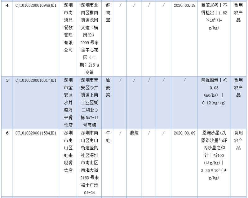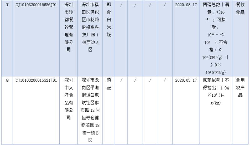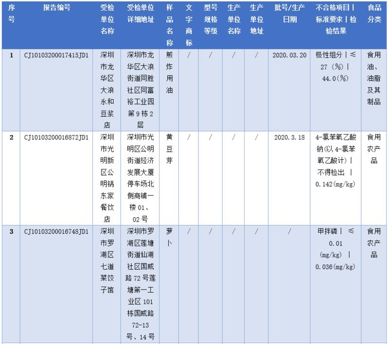 見圳客戶端·深圳新聞網(wǎng)2020年5月1日訊(深圳特區(qū)報記者 楊德琦)4月30日,深圳市市場監(jiān)督管理局發(fā)布第十四期食品安全抽樣檢驗情況通報,3月共抽檢餐飲環(huán)節(jié)食品1009批次,涉及餐飲環(huán)節(jié)經(jīng)營主體919家次,共檢測食品指標6347項次。其中不合格樣品8批次,涉及不合格食品類別有食用農產(chǎn)品6批次,黃豆芽、蘿卜、雞蛋、油麥菜、牛蛙等在列;餐飲食品1批次,為即食白米飯;食用油、油脂及其制品1批次,為煎炸用油。涉及不合格項目類別為獸藥殘留、農藥殘留、非食用物質、微生物污染、品質指標。