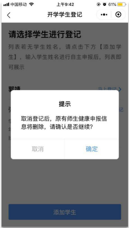 ②點(diǎn)擊“取消登記”,平臺彈出提示“取消登記后,原有師生健康申報(bào)信息將刪除,請確認(rèn)是否繼續(xù)?”,點(diǎn)擊“確定”,即取消成功。取消成功后,可重新進(jìn)行開學(xué)登記。