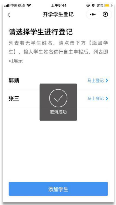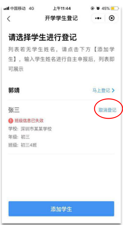 對于已完成開學(xué)登記的師生,如開學(xué)登記頁面顯示學(xué)校信息或班級信息已失效,或選錯登記人員時,請取消此條登記記錄,重新進(jìn)行開學(xué)登記。取消成功后,原申報(bào)的師生健康卡信息將會失效。以下操作步驟以學(xué)生登記為例,具體如下: