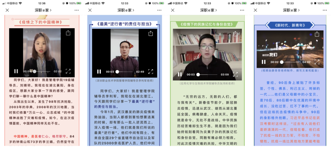 深圳職業(yè)技術(shù)學(xué)院學(xué)生工作部組織33位青年輔導(dǎo)員,推出33講戰(zhàn)“疫情”系列微課程,每天8:30準(zhǔn)時推送。微課程主題涵蓋愛國主義教育、理想信念教育、生命教育、社會責(zé)任感教育、感恩教育,不同的主題、不同的視頻、不同的感悟,輔導(dǎo)員老師和同學(xué)們一起在戰(zhàn)“疫”中成長,為同學(xué)們講述每一個戰(zhàn)“疫”的感人故事。建環(huán)學(xué)院輔導(dǎo)員薛菲菲老師制作精美短視頻、撰寫文案、配樂、配音,以有思想又有溫度的方式與學(xué)生對話。她說,磨煉是成長的催化劑,抗疫是時代給予的成人禮,經(jīng)此一役,中國的年輕人們對責(zé)任和奉獻(xiàn)的感受更加直觀,對勇敢和擔(dān)當(dāng)?shù)睦斫飧由羁?,而中國,也因?yàn)?0后,收獲了青春洋溢的蓬勃力量!