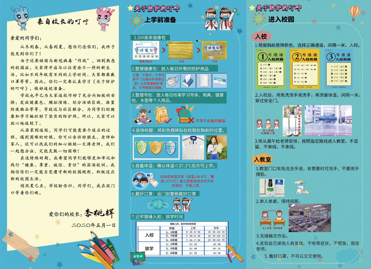 針對即將返校的學生,還有一份特別的《叮嚀》,來自李桃輝校長《愛的叮嚀》,這里有桃輝校長的暖心留言,還有幫助孩子們適應全然不同的校園新生活的各種說明!