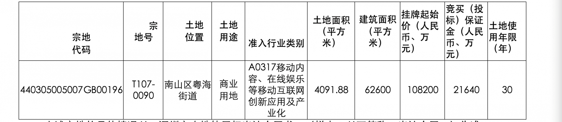 根據(jù)公告,T107-0090宗地位于南山區(qū)粵海街道創(chuàng)業(yè)路,后海河畔,土地用途為商業(yè)用地,準(zhǔn)入類(lèi)別為A0317移動(dòng)內(nèi)容、在線娛樂(lè)等移動(dòng)互聯(lián)網(wǎng)創(chuàng)新應(yīng)用及產(chǎn)業(yè)化,土地面積4091.88平方米,建筑面積62600平方米,容積率:≤15.3,掛牌起始價(jià)108200萬(wàn)元,土地使用年限30年。掛牌期自2020年6月3日起至2020年6月12日15時(shí)止。