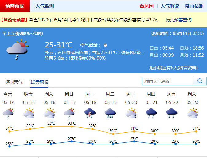 見圳客戶端·深圳新聞網(wǎng)2020年5月14日訊 還記得前兩天的強(qiáng)對流天氣嗎?目前仍是雷雨橫行的季節(jié),臺風(fēng)還需往后靠靠,臺風(fēng)未來兩天不會影響深圳。據(jù)市氣象臺消息,14日深圳以多云天氣為主,但仍有分散陣雨,大家外出記得帶傘,遮陽又能遮雨。