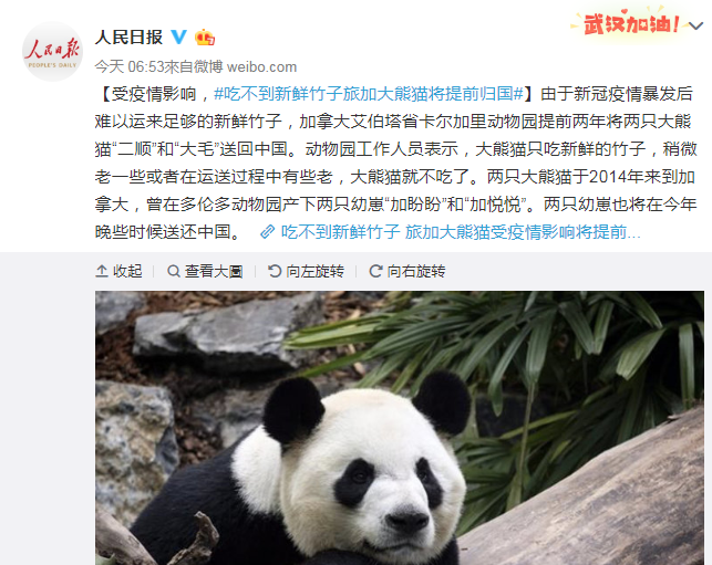 說到國寶,2014年開始旅居加拿大的兩只大熊貓“二順”和“大毛”要提前回國了。